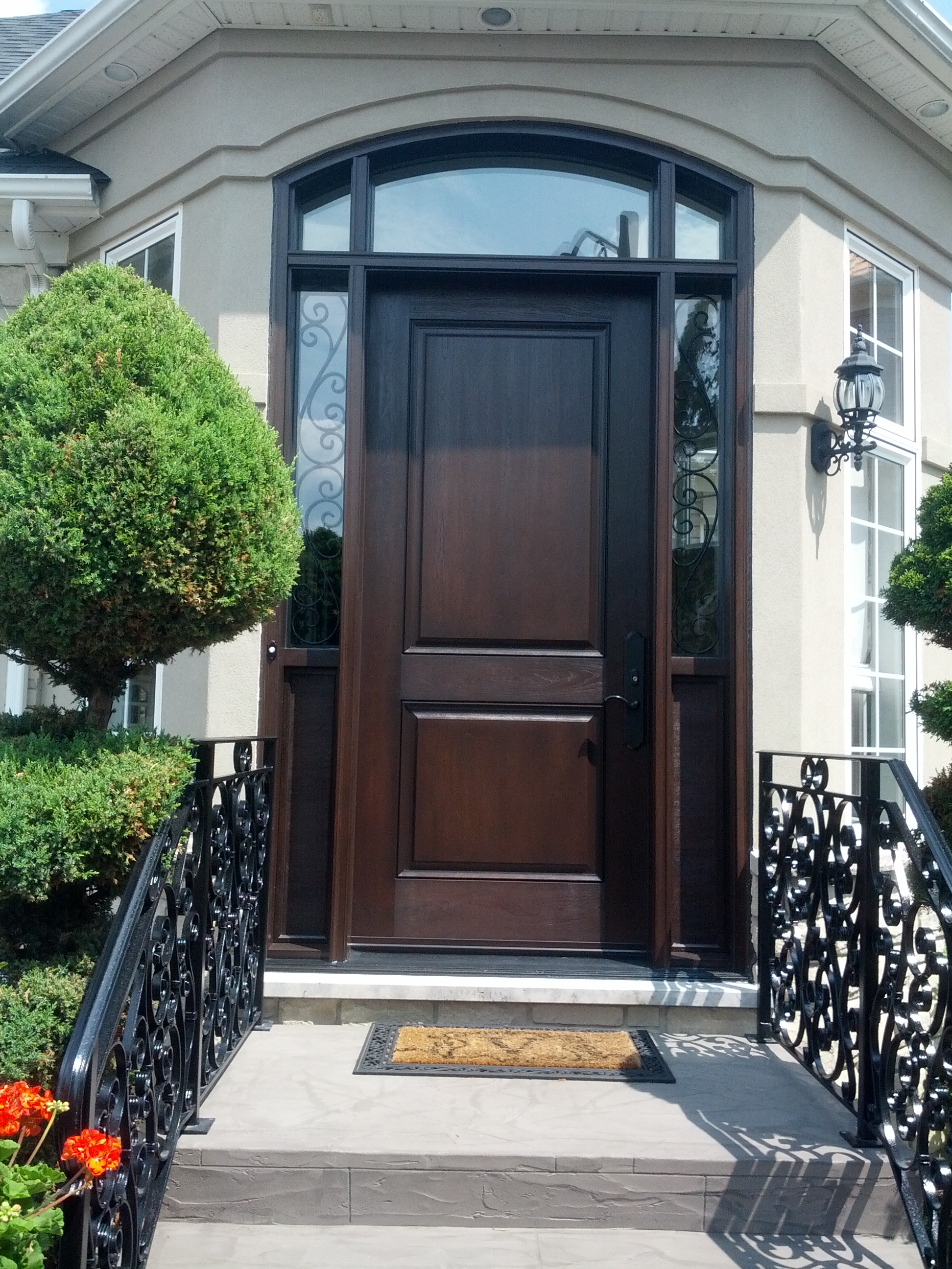 Mastergrain Fiberglass 42 Inch door with Panel Sidelites and wrought Iron transom