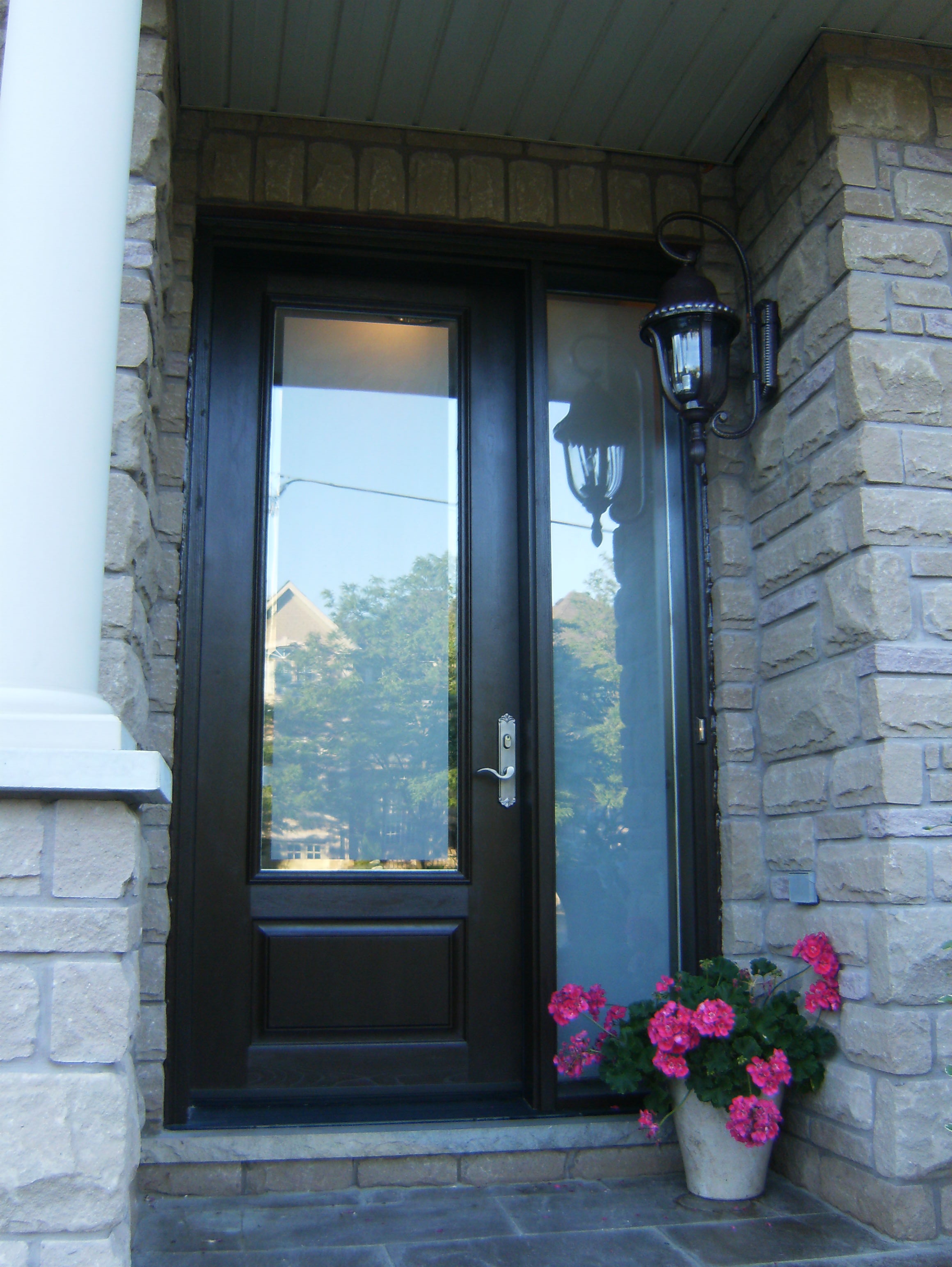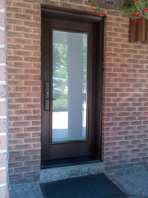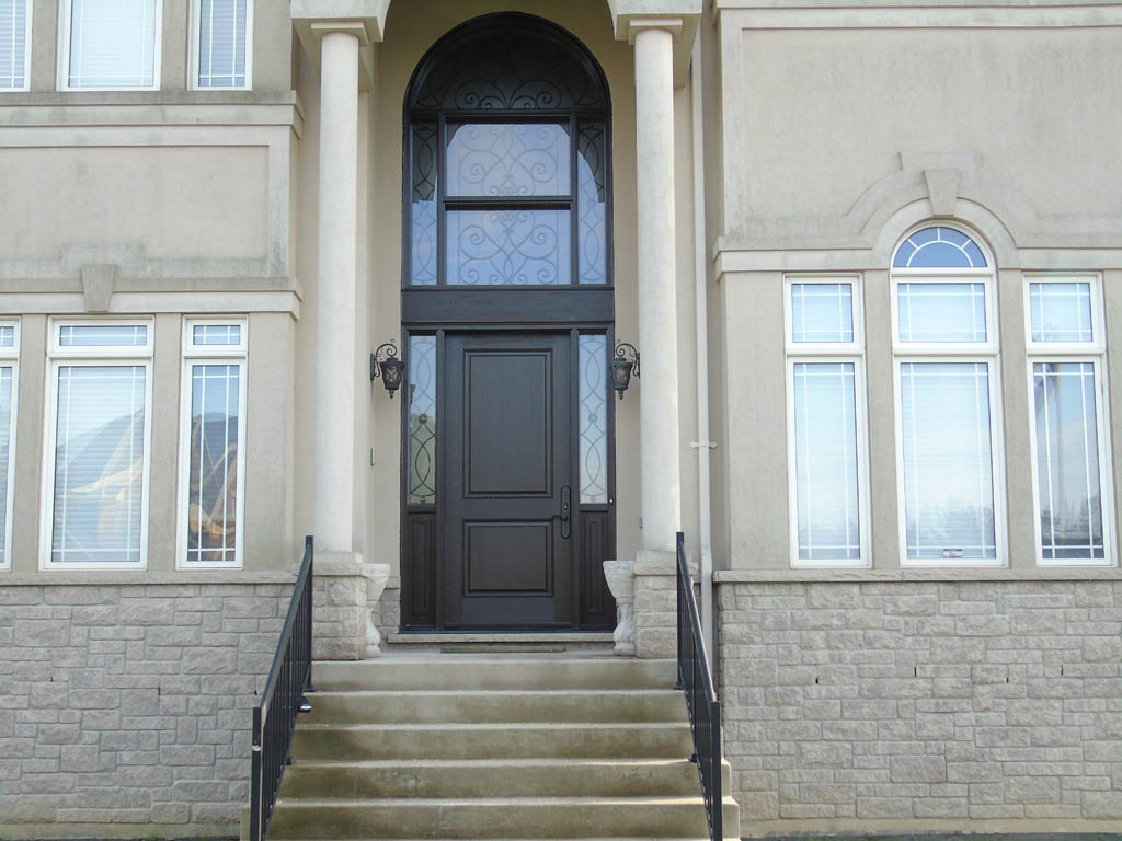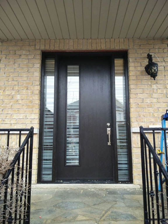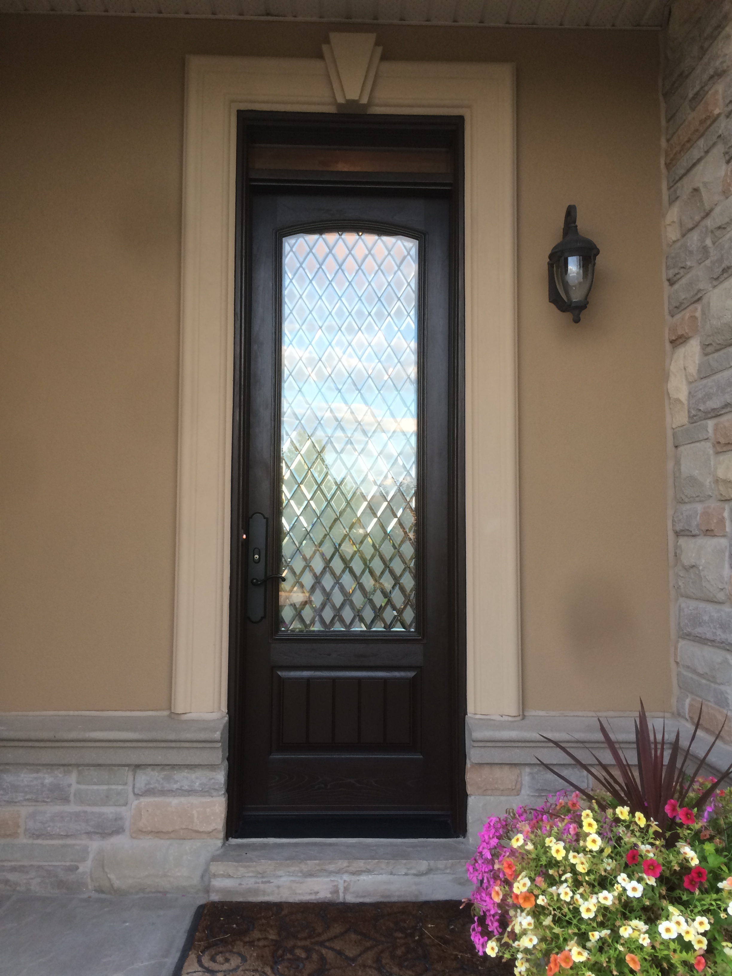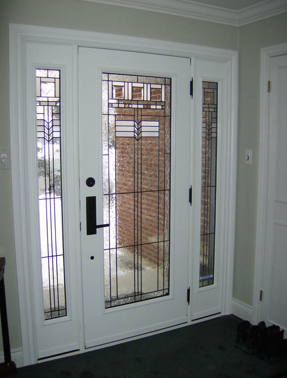 Fiberglass front door and custom side window with sandblasted glass