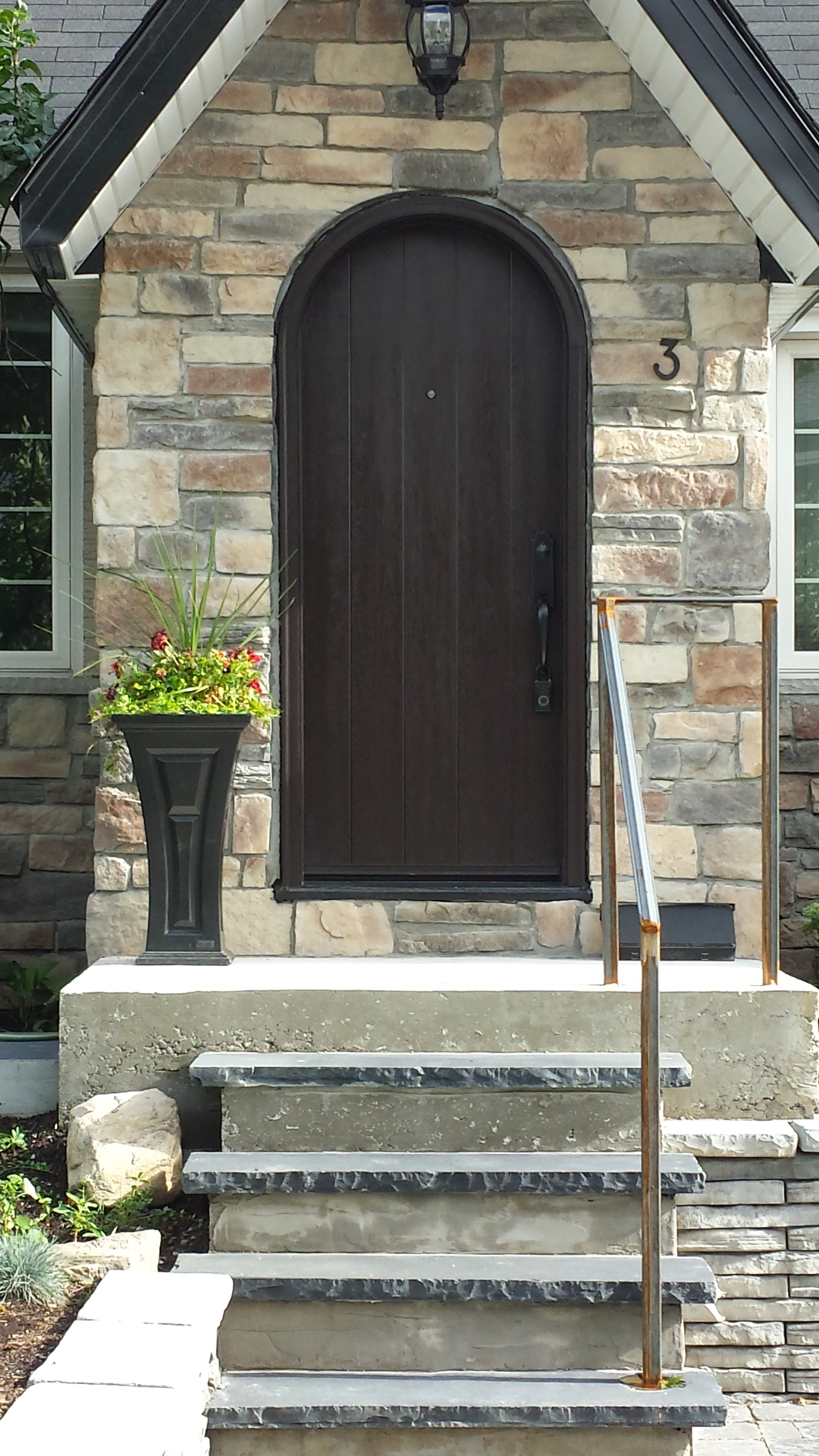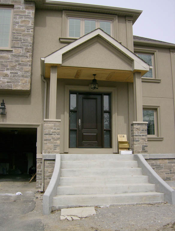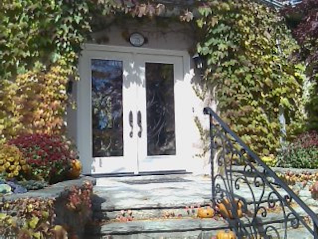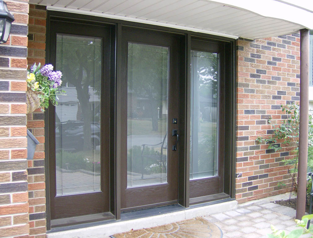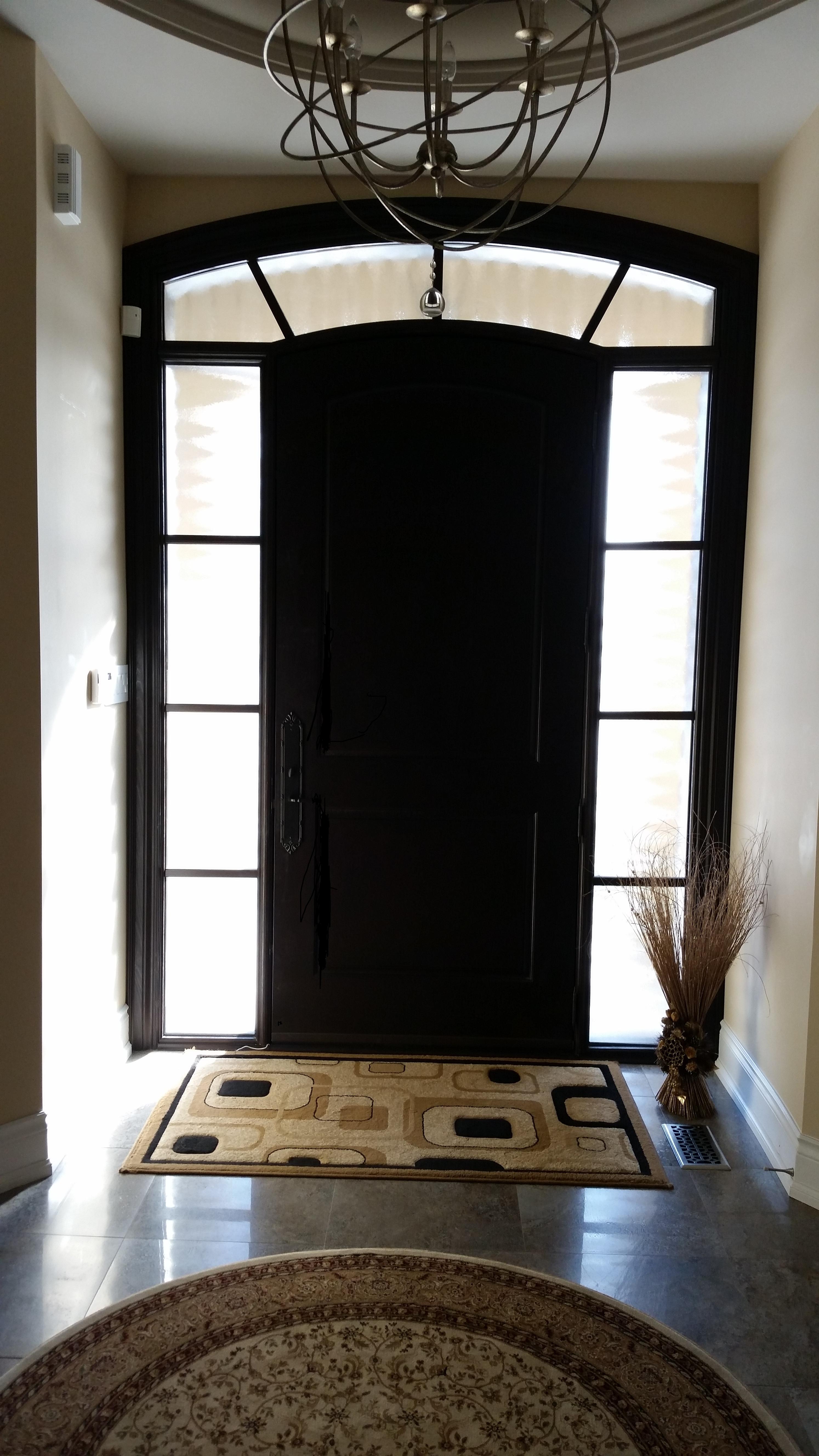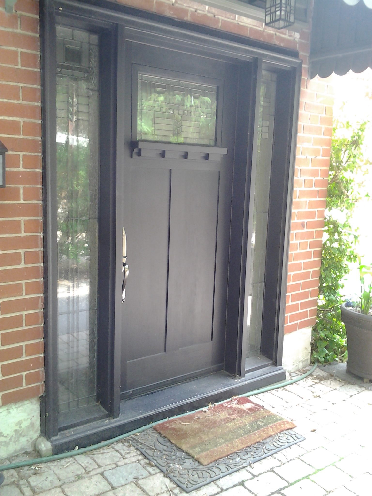 Fiberglass front door and custom side window with sandblasted glass
