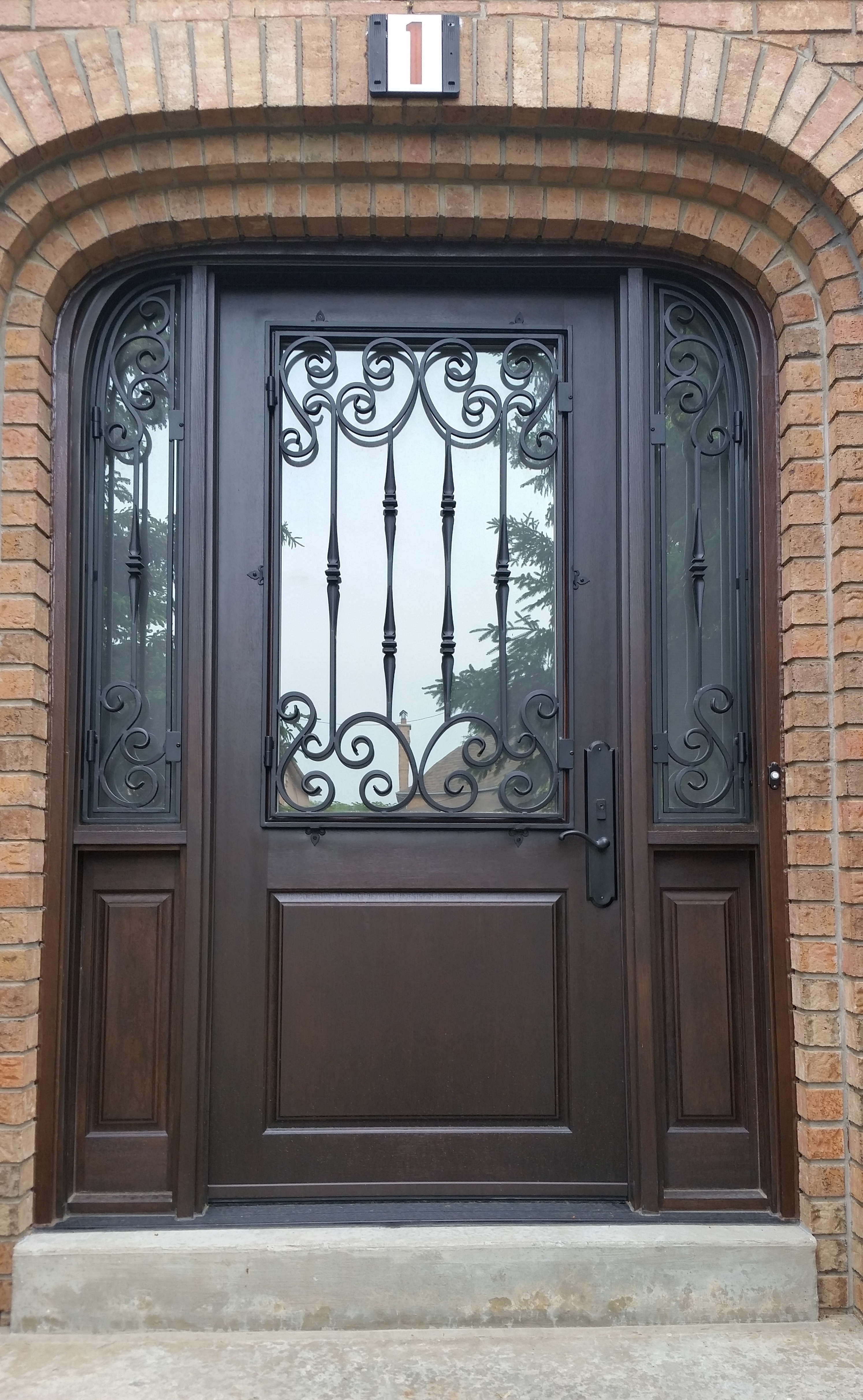 Arched Mastergrain Fiberglass 2 Panel with Custom Wrough Iron Sidelites