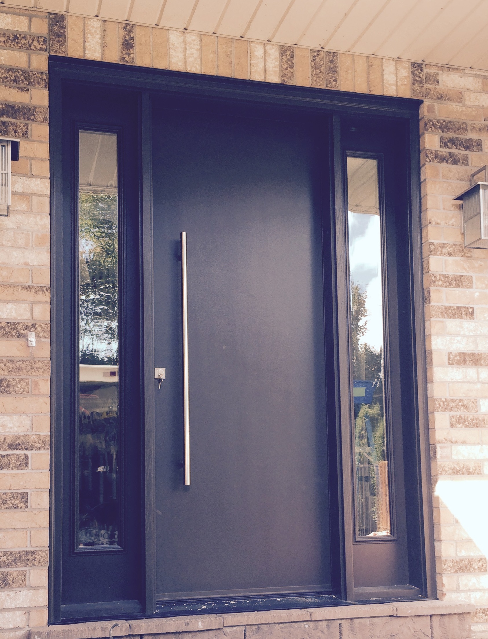 Modern Mastergrain Fiberglass door with Acid Frost glass sidelites with pull bar