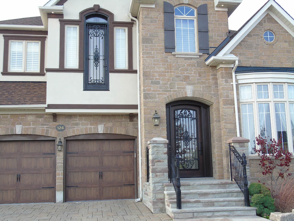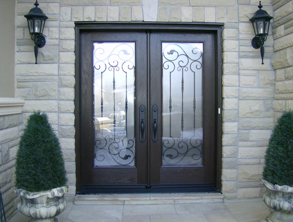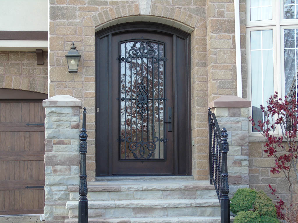Custom Mastergrain Fiberglass door with Miliano Millenia Wrought iron Design